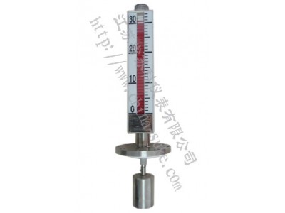 顶装式磁翻板液位计主体外的翻板箱受主体内浮子(具有定向磁性源,按不同介质和压力针对研制)的作用促其翻板翻动并显示红白颜色,并随浮子的移动指示不同的液面高度,红色始终表示液位的高低。在指示器左侧配有醒目的刻度标尺,从而使液位的指示显得更加清晰。