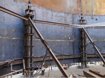 (3)如果带拱顶的储罐,考虑到安全因素,一层壁板完成后,即安装罐顶,罐顶完成后,在罐顶开孔,以便放入提升架。